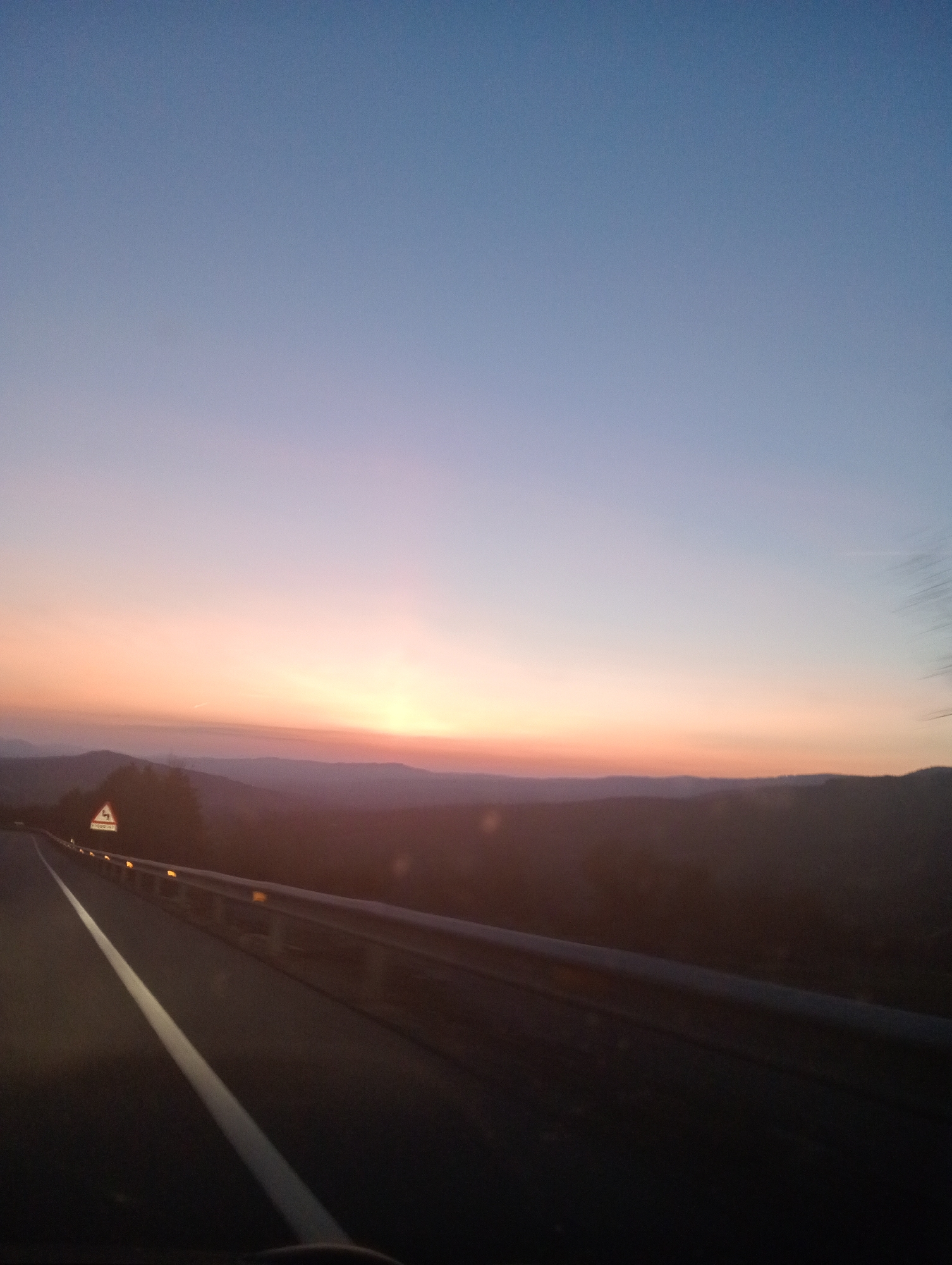 The image depicts an outdoor scene near Casas del Puerto, Spain, during twilight or dawn. The sky presents a gradient from a deep blue at the zenith to a vibrant orange and pink along the horizon. Silhouetted against the bright horizon are multiple layers of dark, undulating mountain ranges. In the foreground, a dark asphalt road extends into the distance, marked by a solid white line on its left side. A metallic guardrail, fitted with yellow/orange reflectors, parallels the road on the right. A white triangular warning sign with a red border, indicating a winding road and the text "1000 MT," is visible on the left shoulder, partially obscured by dark foliage. The scene is devoid of individuals. The perspective suggests the image was captured from inside a moving vehicle.