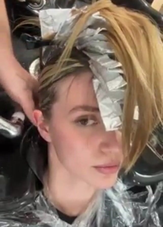 A woman is sitting in a salon chair in a black washbasin, wrapped in a clear plastic cape. She has light skin, neutral eye makeup, and pink lips. Her hair is pulled back, with strands of blonde hair and silver foil packets on top of her head. Water is running over the side of the basin while a man's hands are visible near her left ear, apparently working on her hair.