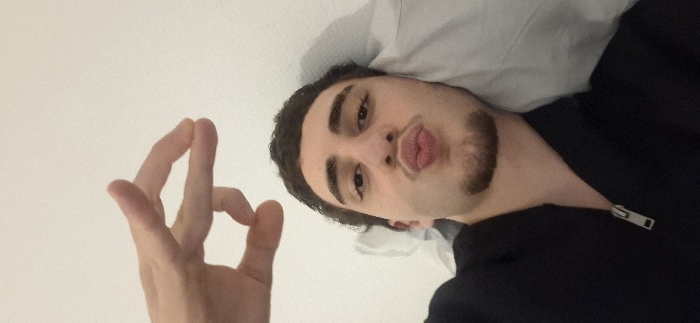 A person lies on a pillow, wearing a black jacket with a zipper. Their hair is short and dark. They make a kissing face towards the camera. The person raises a hand in the air, fingers extended, forming a loose circle with their thumb and forefinger. The background is a plain, light-colored wall. The image is slightly rotated.