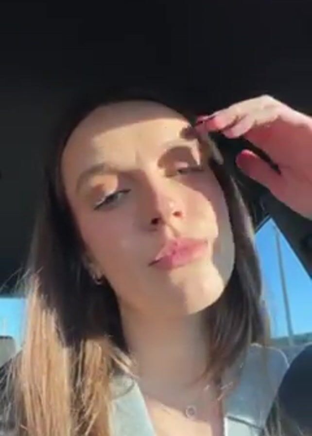 A woman sits in a car, facing the camera. She wears a grey collared shirt and a necklace with a circular pendant. Her hair is light brown and straight. She has light skin, pink lips, and light blue eyes. The sun shines on her face as she opens and closes her eyes. She places her hand on her neck. The interior of the car is visible in the background. The sky is bright blue through the car window. Music plays.