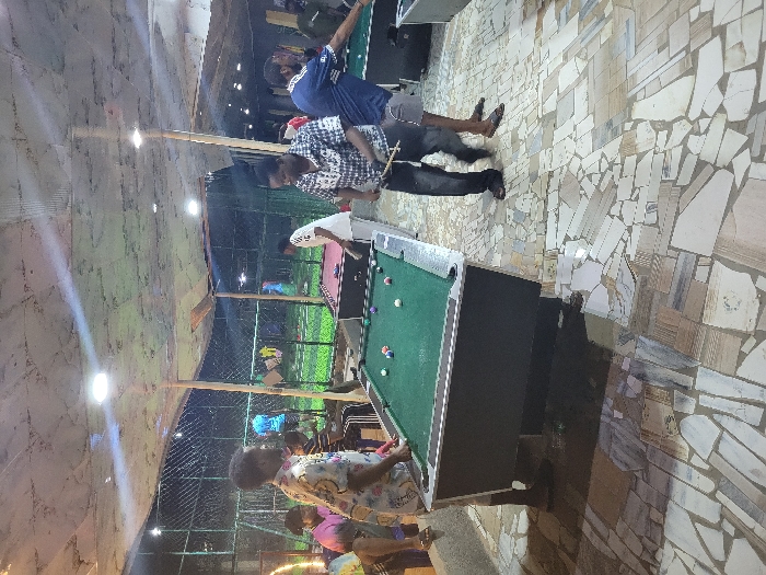A group of people are gathered around a billiards table. One man is playing, while others observe. The table is green with several balls scattered across its surface. The floor is made of mismatched stone tiles. The building seems to be open air with wooden poles and netting enclosing the area.