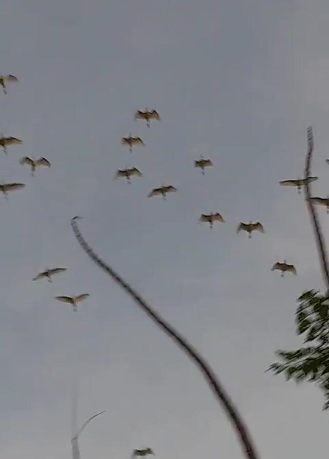 flock of birds in flight against a pale blue sky, sometimes passing behind trees and telephone wires