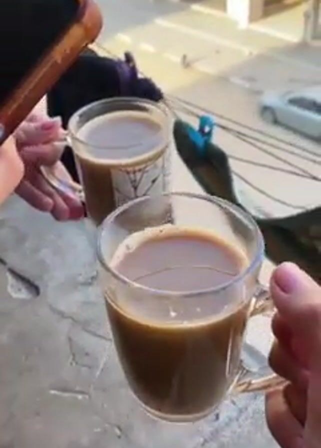 two glass mugs of coffee sitting on a concrete ledge. A person is holding the mugs and a smartphone with a brown case, using the phone while standing on a balcony. In the background, laundry is hanging on a clothesline, and a street with buildings and a car is visible. The lighting suggests it is daytime.