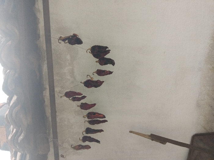 The scene depicts an outdoor building exterior within the city of Pirdop, Bulgaria. A string of approximately 14-15 dried chili peppers, exhibiting dark red to brownish coloration and shriveled textures, is suspended horizontally from a thin line. This line is attached to a dark horizontal beam or support structure positioned along the top of a light-colored, textured wall. Above the beam and wall, a section of a roof constructed with curved, reddish-brown tiles is visible. In the lower-left portion of the frame, a dark, long-handled implement, consistent with a shovel or spade, leans against the wall. No individuals are present.