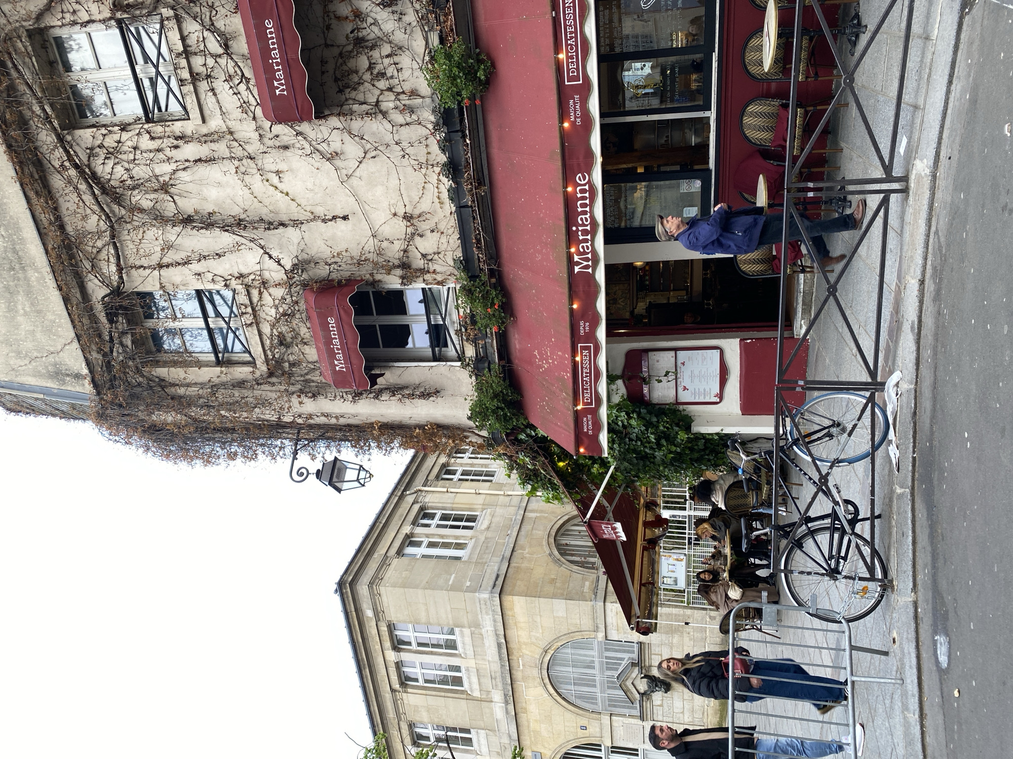 The scene depicts a street view in the Le Marais district of Paris, France, specifically at 2 Rue des Hospitalières Saint-Gervais. The primary subject is the "Marianne DELICATESSEN" restaurant, identifiable by its prominent red awnings and signage. The restaurant occupies the ground floor of a multi-story building with a light-colored, stuccoed facade heavily overgrown with dormant, leafless vines. Upper floors feature windows with black wrought-iron window guards, each beneath a smaller red "Marianne" awning. The main ground-floor awning is also red, displaying "DELICATESSEN," "DEPUIS 1970," "Marianne," and "MAISON DE QUALITE" in white lettering. Above this awning, several black planter boxes contain sparse green foliage and small red flowers. The lower facade of the restaurant is painted red. An outdoor seating area with multiple tables and wicker chairs is set up on the sidewalk, partially enclosed by black metal barriers. Several patrons, approximately five to six individuals, are seated at tables in this area. A dark-colored bicycle with a blue front wheel is chained to the metal barrier directly in front of the restaurant. To the left of the restaurant is a multi-story building constructed of light-colored, hewn stone, featuring classical architectural elements. It has numerous rectangular windows with white frames on its upper floors and large arched windows with grilles on the ground floor. A smaller red awning covers an additional outdoor seating area associated with this adjacent structure, though no patrons are clearly visible there. The street is dark asphalt, and the sidewalk is paved with grey stone. The sky is overcast. Several individuals are present: * In the foreground-left, a man wearing a dark jacket and light trousers walks alongside a woman in a black puffer jacket, blue jeans, and carrying a red shoulder bag. They are moving from left to right. * In the foreground-right, a man wearing a blue jacket and a light-colored flat cap walks from left to right, past the restaurant's main entrance, behind the metal barrier. A black, ornate street lamp extends from the restaurant building's upper facade.