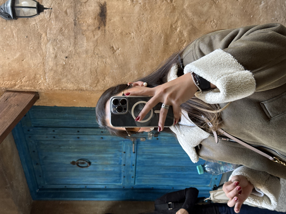 A person takes a selfie in front of a blue door. The individual is wearing a green jacket with white fur trim. In their hand, they hold a smartphone with a transparent case. The background includes a textured brown wall, and a lantern hangs above. A wooden shelf is visible on the left side of the image.