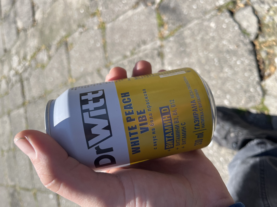 - "A close-up image depicts a light-skinned hand holding a 330 ml Dr Witt Vibe White Peach vitamin drink can" by FM-rToed2, licensed under CC BY 4.0