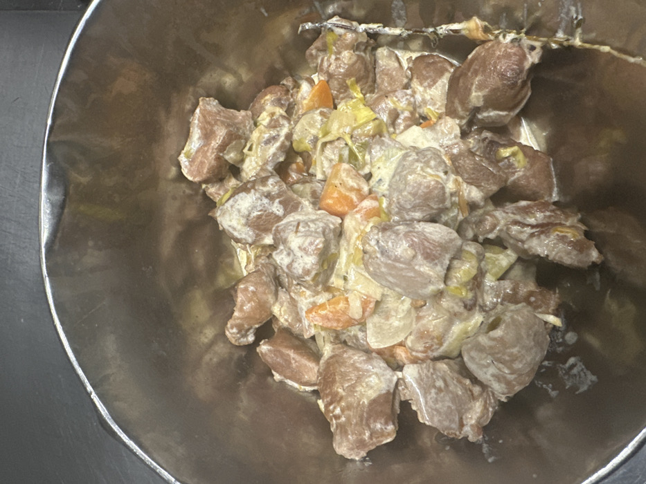 Chunks of meat, carrots, and leeks are tossed together in a creamy, off-white sauce within a stainless steel bowl