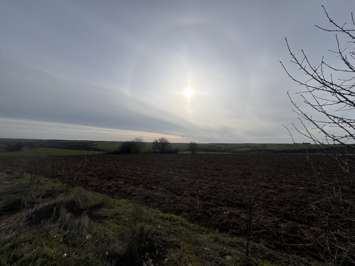 The image displays a wide, rural landscape located near Kamenovo, Bulgaria, under a partially overcast sky. The sun is a prominent bright spot, centrally positioned in the upper half of the frame, with a subtle atmospheric optical phenomenon, possibly a faint halo or parhelion, visible around it. The midground consists of a large, dark brown agricultural field of tilled soil. In the foreground, extending from the right, are numerous bare, dark tree branches without foliage. The foreground on the left features a grassy embankment with dry, sparse vegetation and some scattered green growth. The background shows undulating terrain with patches of green vegetation and distant trees, receding towards the horizon. No people, animals, or specific actions are visible within the scene.