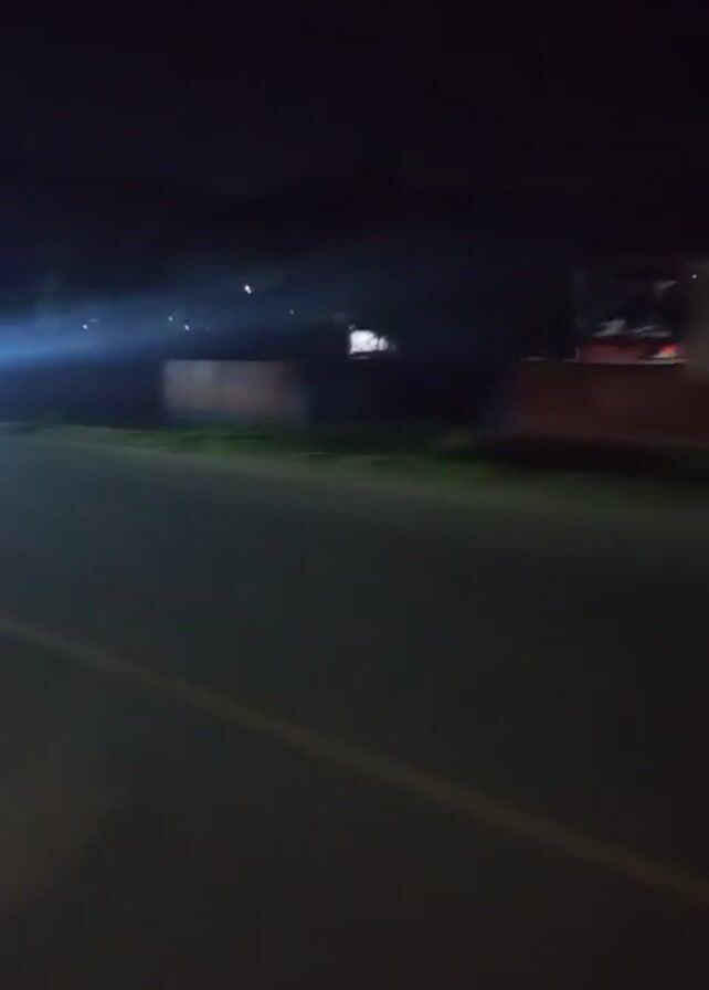 The video depicts a nighttime scene filmed from a moving vehicle on a road. The road is dark, illuminated by streetlights and headlights of the vehicle. The footage is somewhat blurry due to the movement. Various buildings or structures can be seen along the roadside, lit up by artificial lights. A yellow line marks the center of the road.
