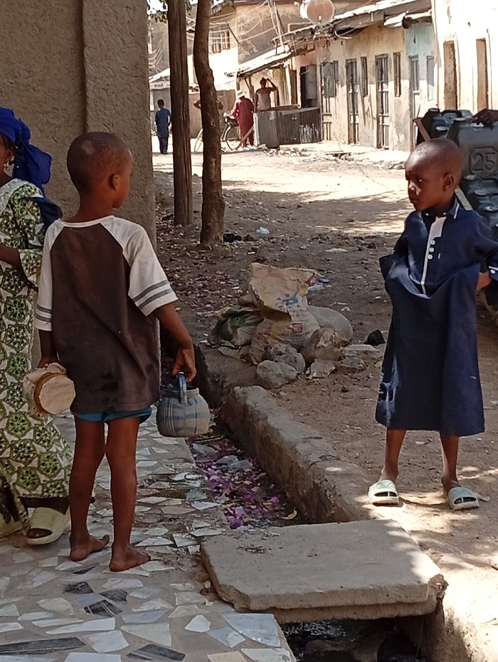 The image depicts a street scene in Gwagwarwa, Nigeria, characterized by dry, unpaved surfaces, simple architecture, and visible debris under bright sunlight. In the foreground, two young male children are the primary subjects. On the left, a barefoot boy, approximately 5-7 years old, stands with his back mostly to the viewer, facing right. He wears a brown and white short-sleeved t-shirt and blue shorts. He holds a small, light-colored wooden drum in his left hand and a patterned pitcher or pot in his right hand. A lighter circular patch is visible on the crown of his head. Partially visible to his immediate left is an adult's lower body, wearing a patterned green and white garment and light-colored slip-on sandals. On the right, a younger boy, approximately 3-5 years old, stands facing left, looking at the first child. He wears a dark blue tunic with white accents on the collar and placket, and light-colored slip-on sandals. His hands are positioned near his waist. The ground immediately around the children features a broken tile mosaic, transitioning to a concrete drainage ditch filled with purple and white debris, leading to a dusty, unpaved area. A flat concrete slab bridges the ditch in the mid-ground. Scattered refuse, including discarded sacks and what appears to be a 25-liter jerry can, is visible in the mid-ground. In the background, a dusty, unpaved street stretches past several weathered single-story and multi-story buildings with barred windows and corrugated metal roofs. Two slender tree trunks or wooden poles are prominent in the mid-ground. Several figures are visible further down the street: a person in blue walking away, a person in red standing near a bicycle, and a person in a light-colored top standing next to a structure. Shadows are prominent, indicating overhead sunlight.