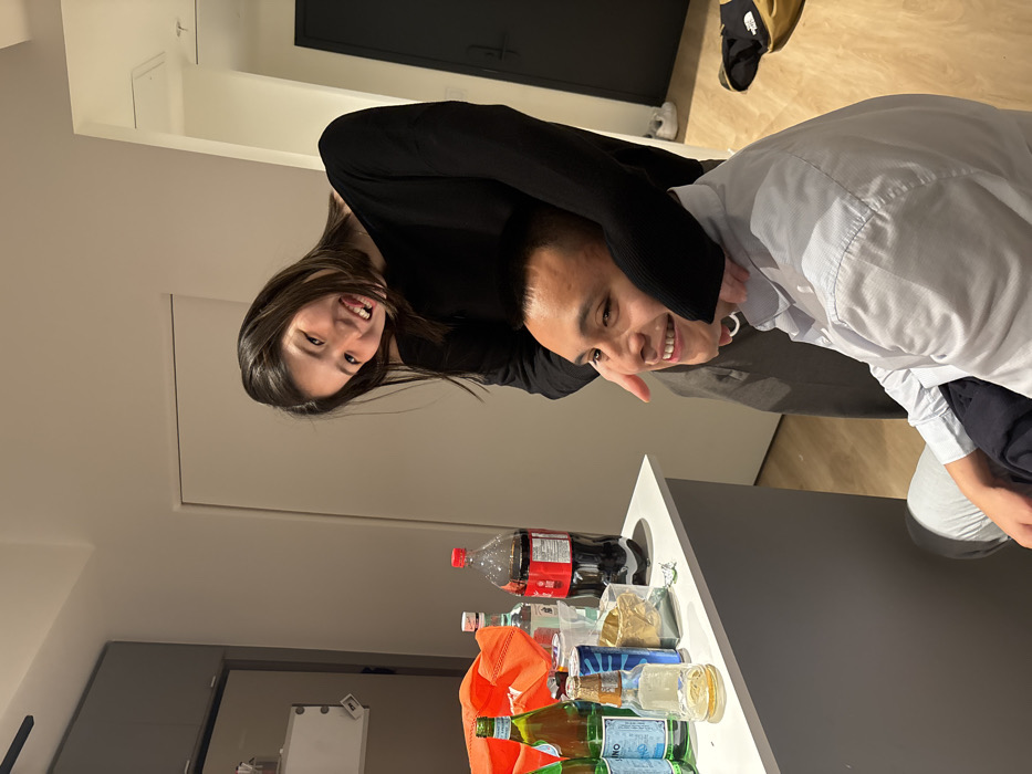 A woman with long, dark hair smiles as she playfully wraps her arm around a man's neck, both looking toward the camera. The man, also smiling, is wearing a light-colored shirt and appears slightly off-balance. In the foreground, a counter is cluttered with various bottles, including Coca-Cola and San Pellegrino, along with other containers and packaging. The background features a plain wall and a doorway, suggesting an indoor setting, possibly a kitchen or dining area.