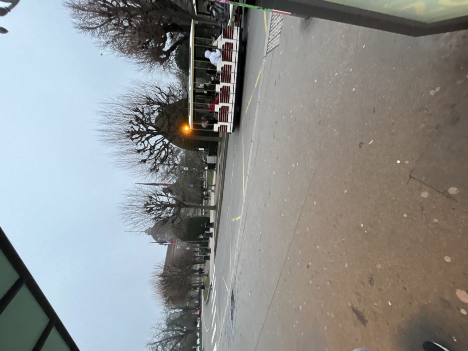 The image captures an urban scene in Strasbourg, France, specifically overlooking a section of the Place de la République, with the Palais du Rhin visible in the background. The sky is overcast, suggesting a dull day, and the bare deciduous trees indicate a winter or early spring season. In the immediate foreground, a dark green structure, likely a canopy or awning, frames the upper portion of the view. Below, gray asphalt pavement extends across the lower half of the frame, showing faint yellow road markings and scattered light-colored debris. A dark, rectangular structure, possibly a sign stand, is partially visible on the far right. The midground is dominated by a light-colored, multi-carriage tourist train, white with red trim and slatted benches, moving from right to left across a wide asphalt road. An amber-orange warning light is illuminated on the front of the train. Several passengers, some in winter clothing including a white hooded jacket, are seated inside the carriages. A second, similar train unit is partially visible behind the first on the right. To the left of the train, a pedestrian crossing is marked by white stripes on the road. A lone individual is visible on a skateboard, positioned on the road near the crossing, moving left. The background reveals a formal park area populated with numerous mature deciduous trees, all bare of leaves and exhibiting characteristic pollarded pruning. The prominent structure in the central background is the Palais du Rhin (formerly Kaiserpalast), a large stone building with a distinctive dome, topped by flags, including the French flag. Additional pedestrians are scattered throughout the park and along distant streets, with vehicles visible further down the road.