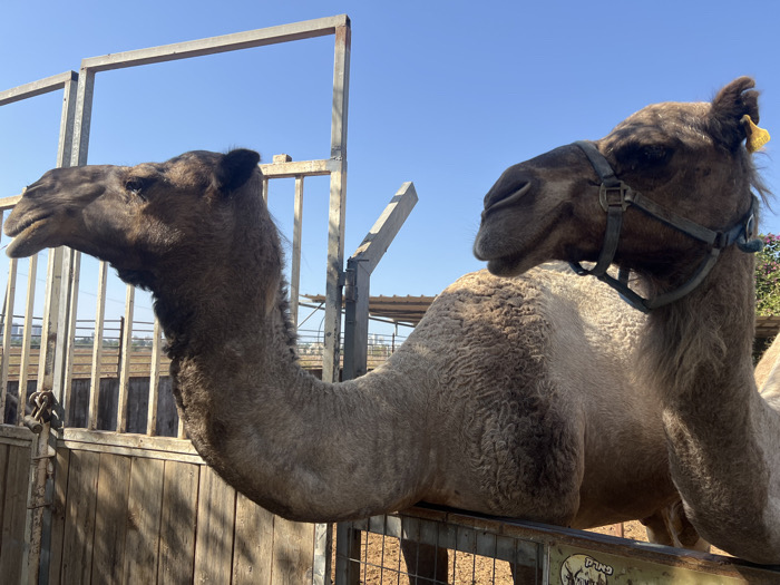 The image displays an outdoor animal enclosure in Hod Hasharon, Israel, under a clear blue sky