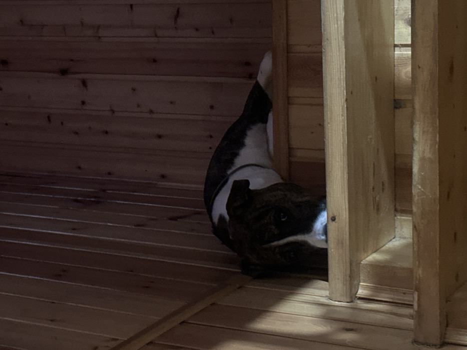 - "An indoor scene in Базарово, Russia, depicts a brindle and white domestic dog, wearing a white collar, positioned on a wooden staircase" by FM-2t2Dl2, licensed under CC BY 4.0