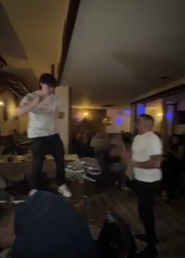 In a restaurant setting, a young man is standing on a set of drums while dancing. He is wearing a white patterned shirt, black pants, and white sneakers. A drummer stands next to him, playing along with the dance. Both are facing a crowd of seated people at tables who are clapping and watching. The restaurant has wooden accents and warm lighting. A balloon decoration is visible in the background. There are several people standing around the perimeter, also observing the performance.