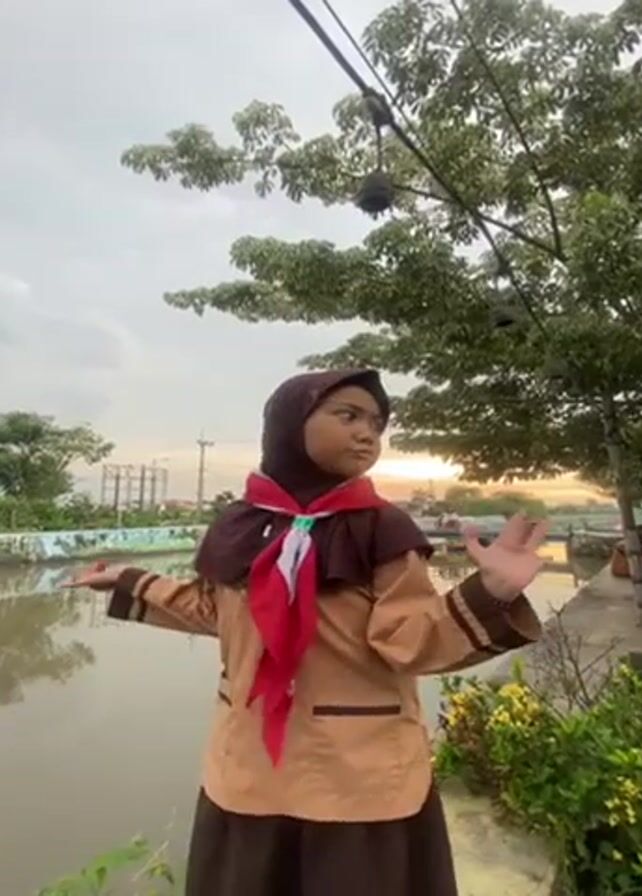 young girl standing by a canal. She is wearing a brown hijab and a tan uniform with a red and white scarf. The canal water is still and reflects the sky. The sky is a mix of clouds and the setting sun, which provides a warm glow behind her. The girl is gesturing with her hands and appears to be speaking, suggesting she may be singing or narrating something. There are trees and foliage around the canal, and some power lines run above her head. In the background, a structure resembling scaffolding can be seen.