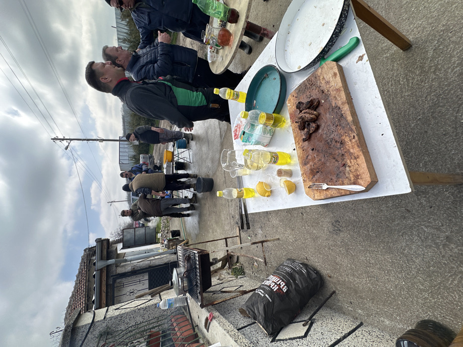 The image depicts an outdoor social gathering in Preslaven, Bulgaria, under an overcast sky with patches of blue. The scene unfolds on a concrete patio adjacent to a rustic, light-colored building with a terracotta tiled roof, dark metal doors, and barred windows. In the left foreground, a large black bag labeled "ДЪРВЕНИ ВЪГЛИЩА" (Wooden Charcoal) leans against the building wall. Adjacent to it stands a metal barbecue grill with active embers and cooking food on its grate. A separate metal pot rests on a stand over the grill to the left. The concrete ground in this area appears damp. A white wooden table occupies the central foreground, laden with various items. A wooden cutting board displays several pieces of dark, cooked meat and a silver fork. Two halved lemons and a small container of toothpicks are also present. The table holds multiple clear plastic bottles containing yellowish liquid, likely oil or spirits, alongside two clear glass pitchers with similar contents and several plastic cups. A green oval metal tray and a large white enamel tray with a blue rim, both partially empty, are also on the table, next to a green-handled knife. To the right of the foreground table, several adult men are gathered. One man, wearing a dark jacket with a green panel, stands with his back partially to the camera, observing the scene. Behind a small, round table holding bottled drinks, two other men are engaged in conversation; one wears a blue puffer jacket, and the other has sunglasses. In the midground, further behind the grill and tables, a group of approximately five to six men are actively engaged around a makeshift outdoor workstation. This setup includes metal bowls and buckets, with visible steam rising, suggesting food preparation. These men are dressed in casual, practical attire, including jackets and work boots. A white pickup truck is visible parked behind this group, and a darker vehicle is partially obscured. The background features a wooden utility pole with power lines, green fencing or shrubbery, and a large, light-colored structure, possibly a greenhouse or storage building, in the distance. The concrete ground across the scene exhibits varied wetness.