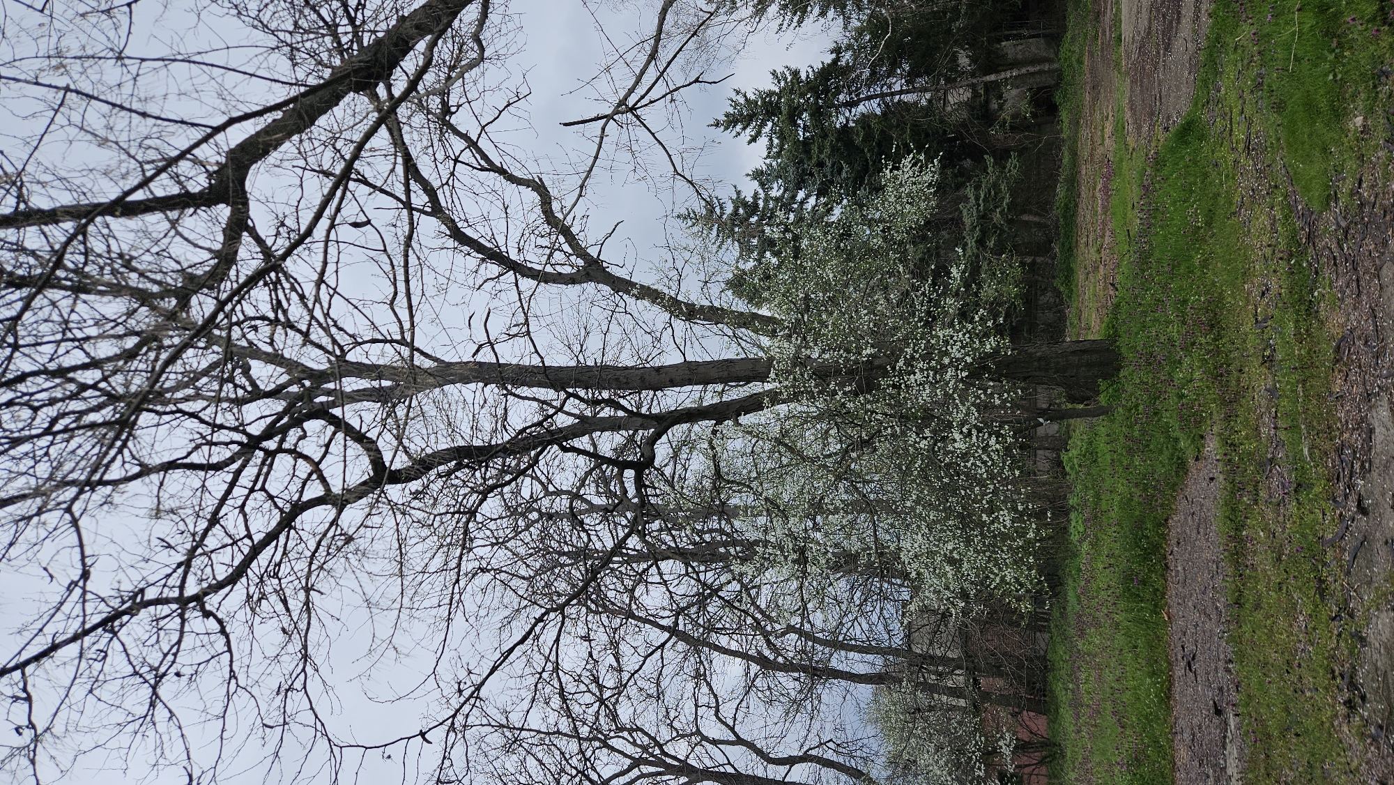 The image depicts a park scene in Stara Zagora, Bulgaria. In the foreground and center are leafless deciduous trees with intricate branching patterns against a pale, overcast sky. To the right, evergreen trees and flowering trees with white blossoms mark the transition to a grassy area interspersed with a dirt path. The groundcover includes green grass and purple flowering ground vegetation. The composition suggests a boundary between a wooded area and a more manicured park space.