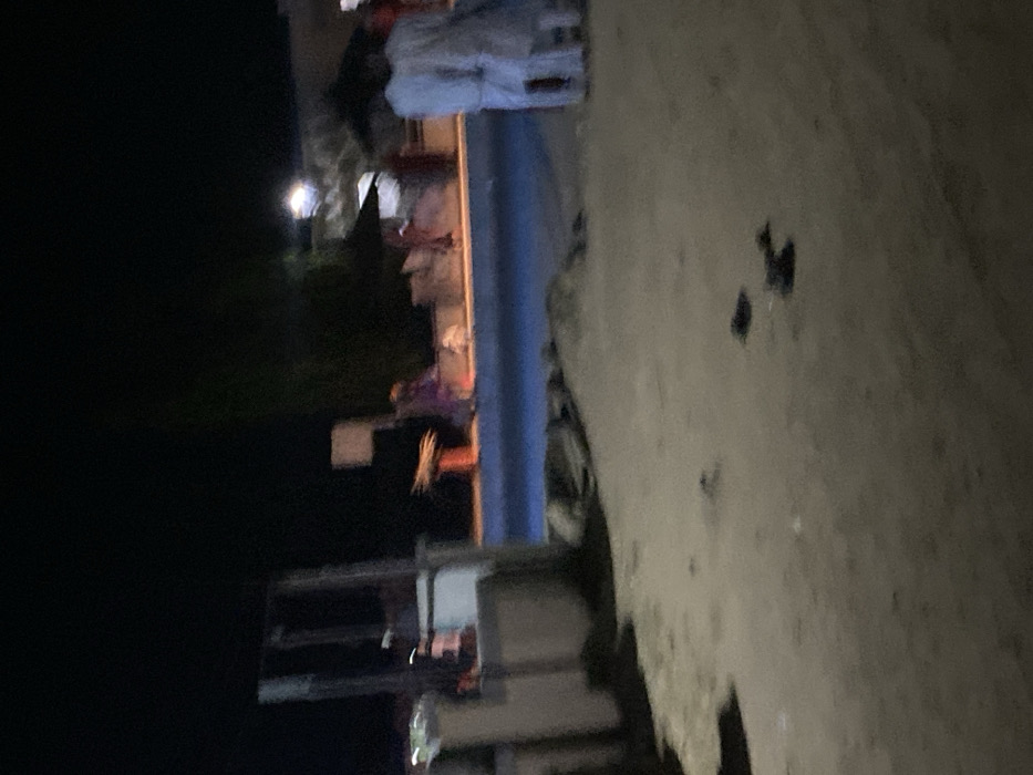 At night, the scene features a partly visible road edge meeting a dark, undefined area. A street lamp illuminates a portion of the scene, casting light on figures standing behind a blue barrier. A sign and a pole, partially visible due to the darkness, stand alongside the barrier. The overall image quality is poor, with limited detail due to the low lighting conditions.