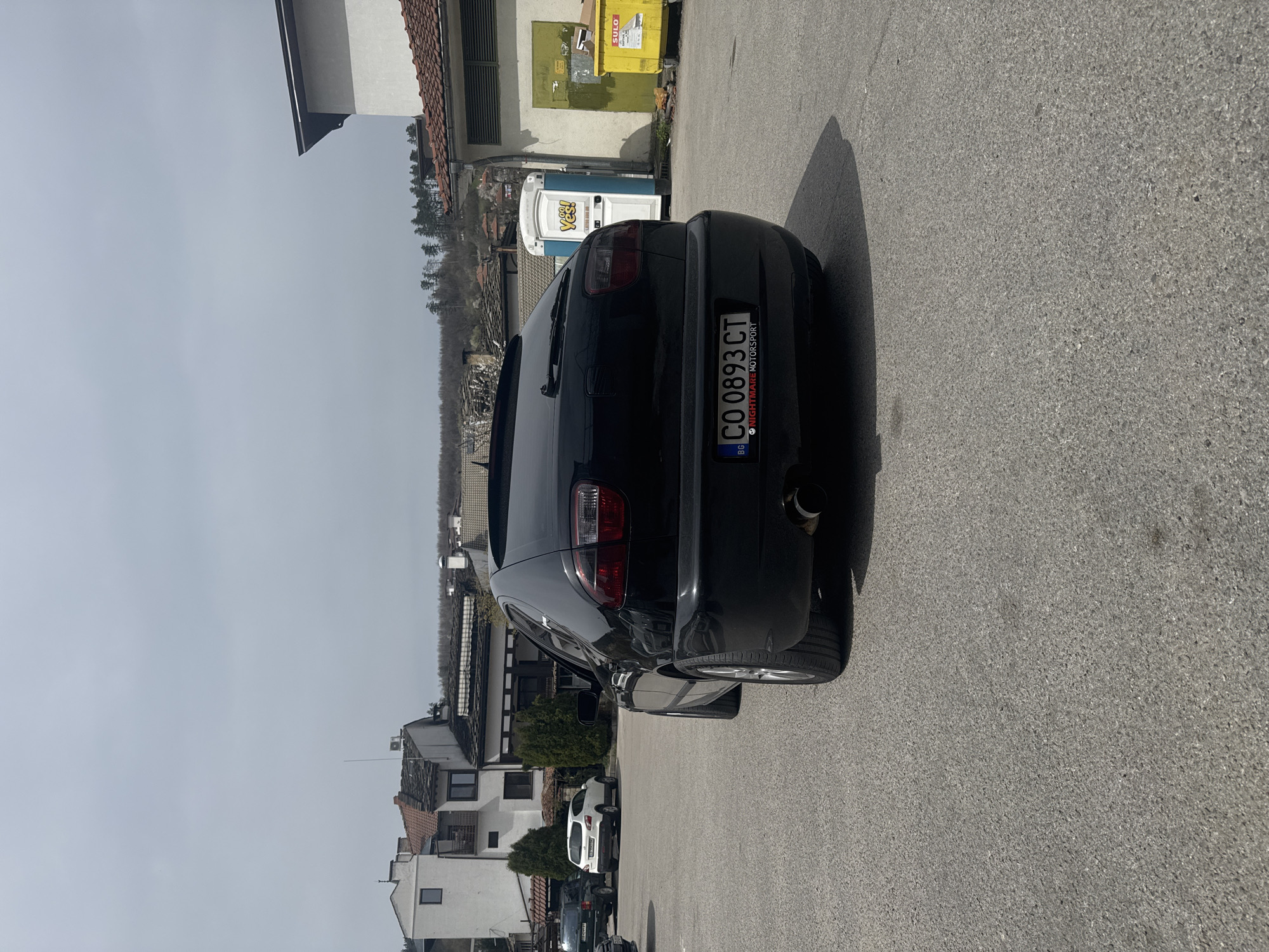 The image depicts the rear of a black car parked on an asphalt surface. The license plate number is "CO 0893 CT," with a Bulgarian flag present. In the background, there are buildings with residential architecture, trees, and what appears to be a portable toilet and a dumpster. The photograph appears to be taken outdoors on a clear day. The location is within the city of Tryavna, Bulgaria.