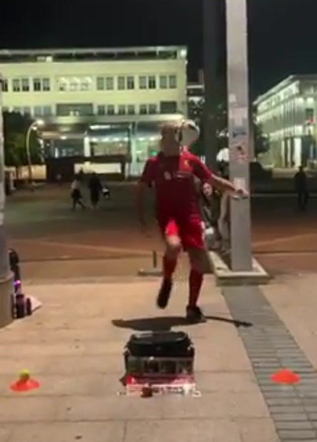 A man in a red soccer uniform is performing tricks with a soccer ball in a public square at night. He is standing in the center of the frame, juggling the ball on his feet, knees, and head. His arms are extended for balance, and he is smiling. Behind him is a stereo playing music, and there are orange cones scattered around him. In the background, there are several people walking and sitting, and buildings with lit windows. The square is paved with gray and white tiles. There are lampposts. There is also a circular advertisement column to the left.