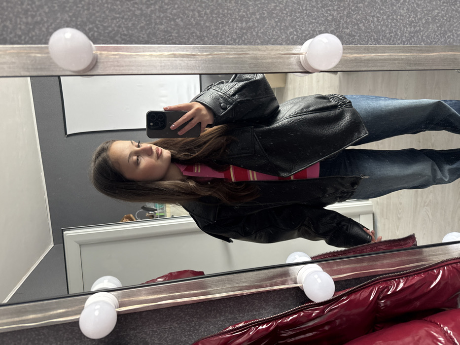 A young adult female is depicted taking a mirror selfie indoors. She possesses long, dark brown hair and a fair complexion. She is dressed in a black, textured leather bomber jacket over a pink polo shirt with red and light yellow horizontal stripes, paired with dark blue denim jeans. Her right hand, exhibiting light-colored nail polish, holds a dark-colored smartphone, aimed at her reflection in a full-length mirror. The mirror features a distressed light grey wooden frame to which five spherical LED vanity bulbs are attached; two are visible on the left side of the frame, and three on the right. To the immediate left of the female's reflection, a glossy red puffer jacket is partially visible, hanging vertically. The reflected background reveals a dark grey textured wall or wallpaper, a white interior door, and a white rectangular object consistent with a photography softbox or light diffuser. The floor appears to be a light, neutral color. The scene is an interior room, likely a private residence. The precise location within the city of Sofia, Bulgaria, cannot be determined from the visual content.