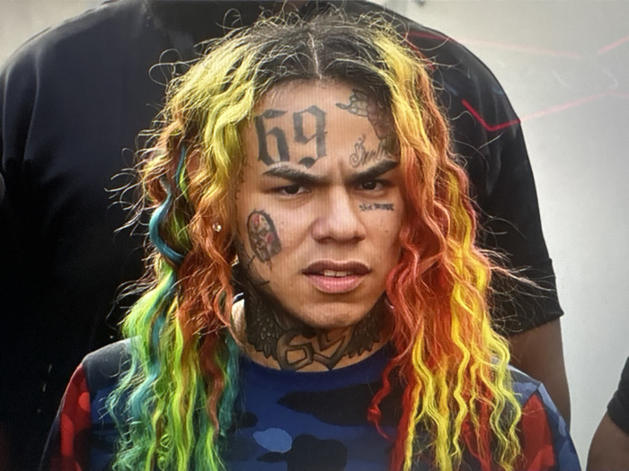 A close-up shot features Tekashi 6ix9ine, adorned with vibrant rainbow-colored hair styled in loose waves
