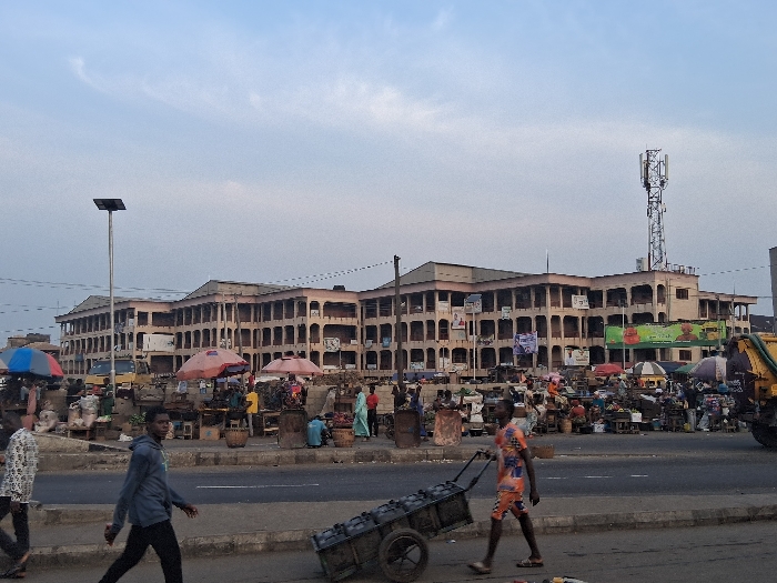 A bustling outdoor marketplace occupies a roadside with numerous vendors and shoppers beneath colorful umbrellas. A multi-story building with arched columns overlooks the scene. Pedestrians traverse the foreground, one pulling a cart laden with goods. Utility poles and a telecommunications tower stand tall against the sky. The scene is a vibrant display of commerce and activity, possibly in an urban setting.