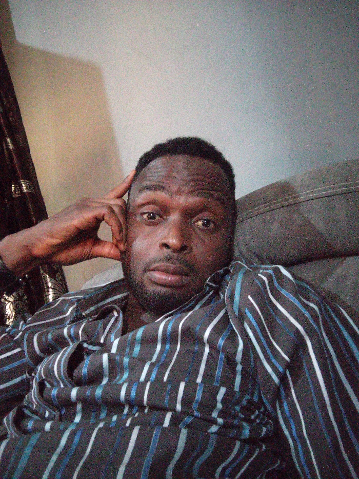 An adult male with dark skin and short dark hair is depicted in a head-and-torso shot, seated within an interior residential setting in the city of Unknown, Unknown