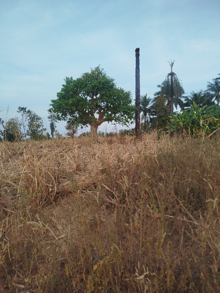 This image depicts a rural or semi-rural landscape in Vana, Nigeria, under a clear, light blue sky. The foreground is dominated by dense, desiccated vegetation, primarily tall, light brown to yellowish-brown grass and plant debris, suggesting a dry season or fallow field. Some sections of this dry vegetation appear matted or flattened. In the mid-distance, a large, robust tree with a full, rounded canopy of vibrant green leaves stands prominently on the left. To its immediate right, a tall, slender, dark, and seemingly dead or burnt tree trunk rises vertically, devoid of branches or foliage. Further into the background, a cluster of various trees is visible, including several palm trees, some with dark trunks and others with a sparse crown of drooping, brown fronds. On the far right, a group of broad-leafed plants, consistent with banana plants or similar tropical vegetation, exhibits healthy green leaves. The sky is uniformly light blue with no significant cloud cover, indicating an open environment. No human figures, animals, or man-made structures are discernible in the scene.