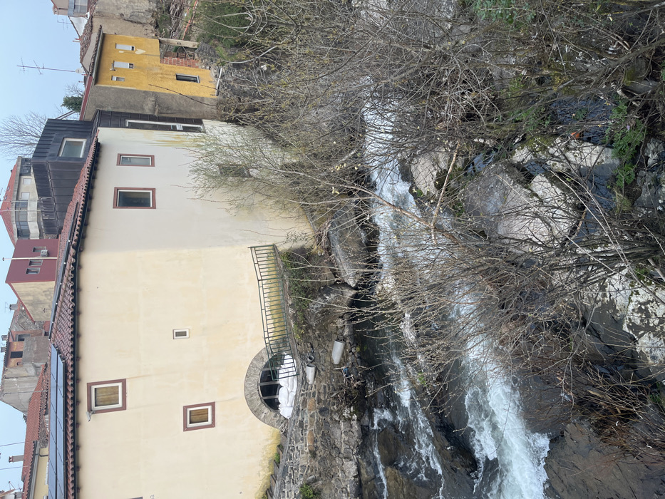 The image displays a river flowing through an urban environment in Bragança, Portugal. The scene is dominated by a river with clear, fast-flowing water exhibiting rapids over dark rocks in the lower half of the frame. On the left bank, a multi-story building with a light cream-colored stucco facade and a red tiled roof is prominent. The roof features numerous solar panels. Several rectangular windows with dark brown frames are visible on the facade. At the ground level, an arched window or opening is partially obstructed by a stack of white sacks or sandbags. A dark green metal railing, partially covered in moss, extends from this building's base over the riverbank. Two grey pipes protrude from the stone foundation wall near the water. To the right of this cream-colored building, a structure with modern dark grey or black cladding and a steeply pitched roof rises. Adjacent to it on the far right, a building with a bright yellow stucco facade and a red tiled roof appears to be in a state of partial disrepair or undergoing construction, with exposed sections visible. Various other residential buildings with red and grey tiled roofs are visible on higher ground in the background under an overcast sky. The foreground and sections of the riverbanks are populated by numerous deciduous trees and bushes, mostly bare-branched, with some exhibiting small, light-colored buds. There are no individuals present in the depicted scene.