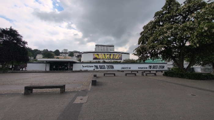 front of the "F.A.M. Boecker Zentrum" (F.A.M. Boecker Center) building, located at 51.256° N, 7.157° E in Wuppertal, Germany. The building is a large white structure with a flat roof and a sign with the building name in black lettering. The sign is below a large billboard with a yellow graphic and the words "WUPPERTAL" in large, yellow letters. The building has a green awning over the entrance. The image is taken from a wide-angle perspective on the paved area in front of the building, with a large tree on the right side of the image. There are benches in front of the building and several people walking in the distance. The sky is overcast with a few clouds. The weather is cloudy and the scene is moderately lit. The time of day is likely late morning or early afternoon.
