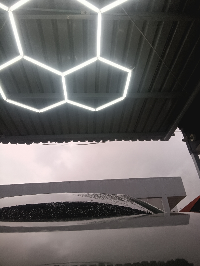 A low-angle shot reveals a series of interconnected hexagonal LED lights illuminating a corrugated metal ceiling. Below, the rain-soaked windshield of a car reflects the overcast sky. A section of a building is visible behind the car. The overall composition is gray and muted, emphasizing the contrast between the artificial light and the gloomy weather.