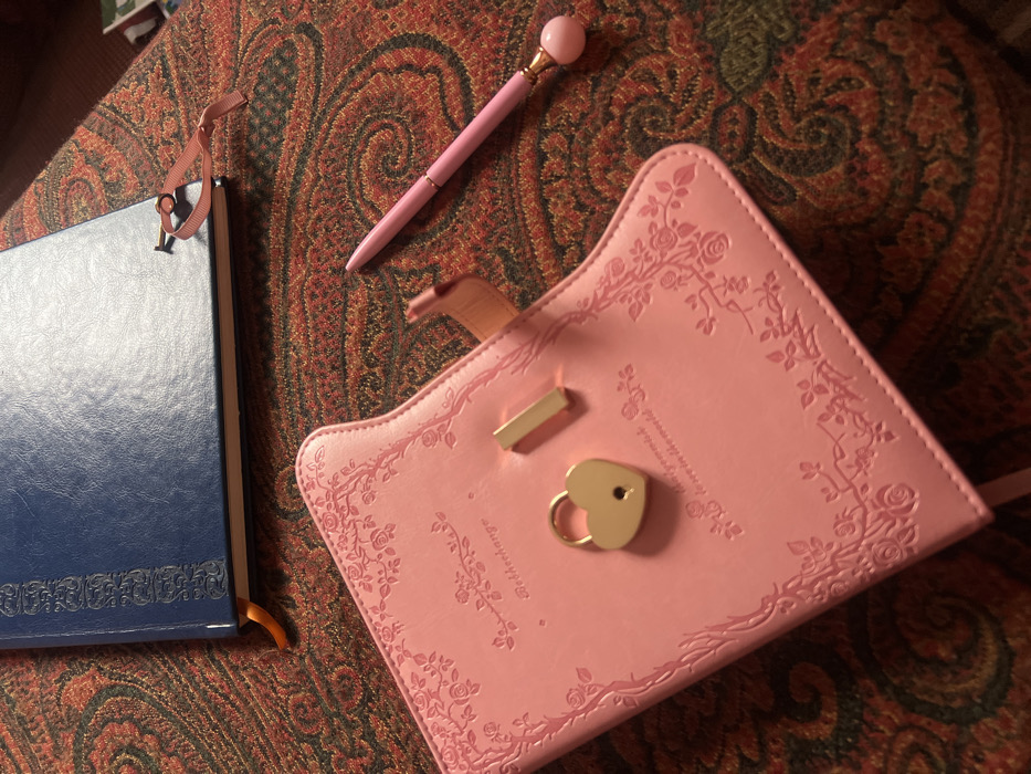This scene is located in Ksar-el-Kebir, Morocco. The image displays three stationary objects on a patterned textile surface. In the foreground, a pink faux-leather journal or diary, embossed with rose vine patterns and text reading "Betterchange" and "the biggest wish is love in the world," is positioned diagonally. On its surface rests a detached gold-colored heart-shaped padlock with a keyhole, alongside a gold-colored rectangular metal bar, indicating components of a locking mechanism. A pink ribbon bookmark extends from the journal's right edge. To the right of the journal, a pink pen with a gold-colored band and a spherical pink end is angled towards the upper right. Partially visible behind the pink journal is a blue hard-cover notebook or book, featuring embossed designs and a pink ribbon bookmark, with an additional orange bookmark at its lower edge. All items are situated on a fabric surface characterized by a prominent paisley pattern in shades of red, orange, green, and dark brown. No individuals or active interactions are present.