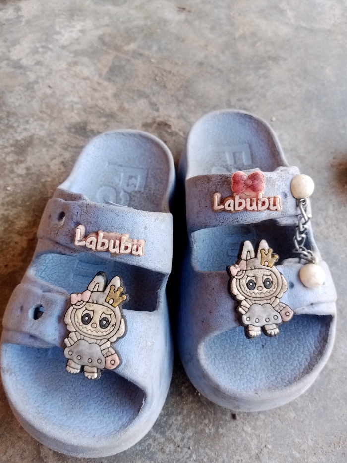 Two light blue children's sandals are displayed on a gray surface. Both sandals have the word "Labubu" on the top strap. Each sandal features a cartoon-like character. The right sandal has a dangling charm chain with two white pearls. Both sandals appear slightly worn.