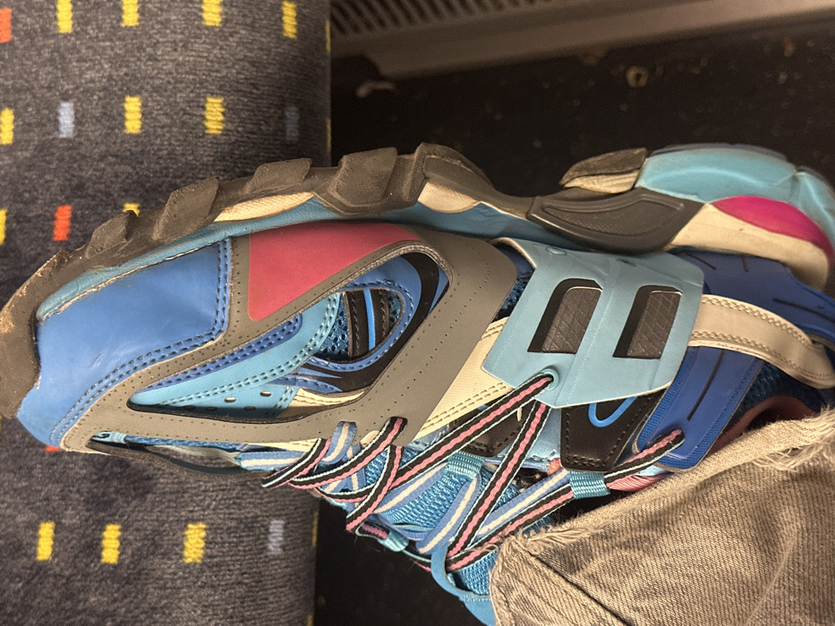 A close-up, downward-angled view depicts an individual's left foot, encased in a multi-paneled athletic shoe. The shoe features a complex construction with predominant colors of various blues (royal blue, sky blue), grey, black, white, and vibrant fuchsia accents. The upper combines synthetic materials and mesh, displaying a layered design with visible stitching. Pink and black striped laces are tied across the tongue. The shoe's thick, segmented sole is grey and black, exhibiting a textured tread pattern. The wearer's leg is covered by light grey denim fabric, possibly jeans, which has a visibly frayed hem. The background consists of a dark blue or grey patterned fabric seat, commonly found in public transport, adorned with small, horizontally aligned rectangular dashes in yellow, orange, and light blue. Below the shoe, a dark, ribbed surface, potentially a floor panel or vent within the vehicle, is partially visible. The scene does not contain visual elements to confirm the requested location of Oron, Switzerland.