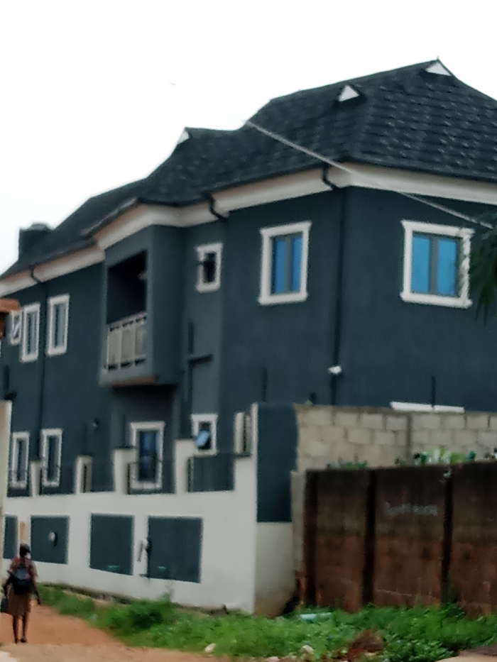 The scene depicts a residential street in Lagos, Nigeria, under an overcast sky. A prominent multi-story building occupies the center and left of the frame. This building features a dark blue-grey painted facade with stark white trim outlining numerous rectangular windows and structural elements. The windows on the upper floors display a light blue tint. A centrally located balcony with light-colored railings extends from the second floor. The building is topped with a dark, possibly charcoal grey, tiled roof featuring multiple gables. Several external air conditioning units are visible on the building's exterior walls. In the foreground, an unpaved, reddish-brown dirt path or road runs from the lower left towards the center. Green vegetation, consisting of grass and weeds, grows along the edges of this path and in front of the walls. On the far right, a light grey cinder block wall is partially obscured by a darker, textured wall or fence in the immediate foreground. One individual, seen from behind, walks away from the camera on the dirt path in the lower left quadrant. This person wears a dark top and a light brown or khaki-colored skirt or dress, carrying a dark backpack. Electrical wiring is visible strung across the upper right portion of the image, possibly connecting to the building.