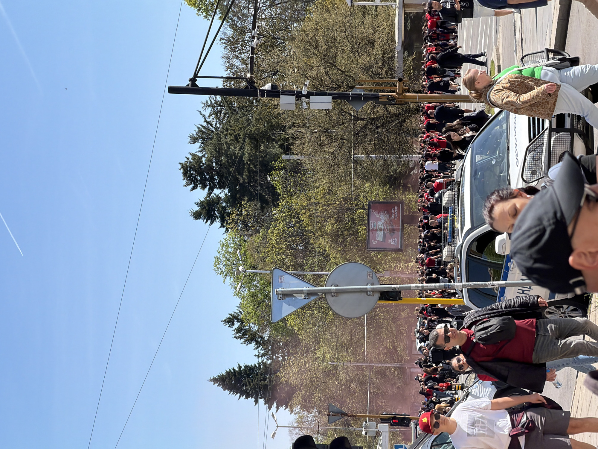street scene in Sofia, Bulgaria. A large crowd of people is gathered on a street, many wearing red shirts. There are law enforcement vehicles present, including at least one Gendarmerie car. The crowd seems to be interacting with the police presence. The background includes trees and signs. The sky is blue and clear. Specific signs and traffic lights are visible, along with power lines overhead.