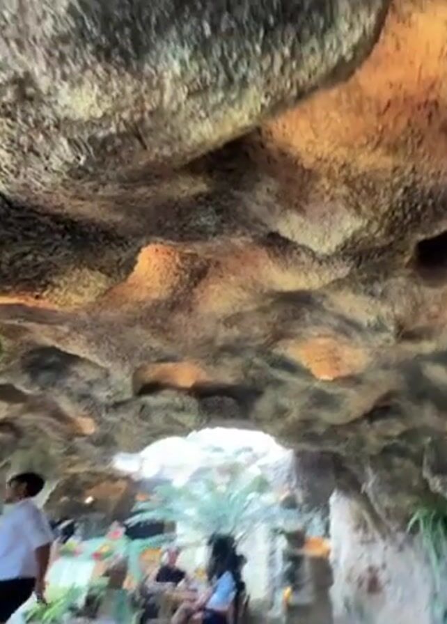 The camera looks up at a faux rock ceiling in what appears to be a restaurant