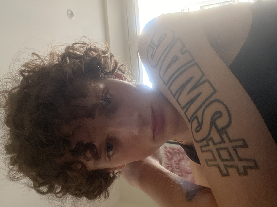 A person with curly brown hair leans into the frame, looking at the camera. Light shines from behind. Their right arm is visible, featuring a large tattoo with the word "SWAG" stacked vertically above a hashtag symbol. The tattoo has a bold, outlined style. The person is wearing a black top. A pale pink object, possibly a decorative piece, is visible in the background near the center of the image.