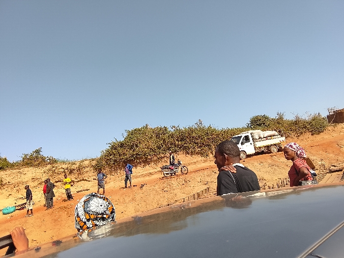 The image depicts an outdoor scene in Ibi, Nigeria, characterized by dry, reddish-brown earth and a clear blue sky. The ground slopes upwards from left to right, featuring scattered green bushes and small trees. A dirt path or road traverses the midground horizontally. In the immediate foreground, the dark gray roof and side of a vehicle are partially visible, with a hand in the lower-left corner. From this vehicle, a male with dark skin and short hair, wearing a black t-shirt with a white shoulder stripe, is visible from behind, facing right. Next to him, a female with dark skin, wearing a red top and a patterned red, white, and dark headscarf, is visible in profile, also facing right. Partially obscured below them is an individual with a white, orange, and black patterned head covering. On the dirt path and sloping terrain, several individuals are present. Towards the far left, a person in a white top and dark shorts stands near a light blue basin. Further right, a man in a yellow shirt stands, and another in a dark top with a red detail is visible. A man in a blue shirt and dark shorts stands further right. A dark-colored motorcycle with a rider is centrally positioned on the path, and behind it, a man in a blue hoodie is visible. In the upper-right midground, a white flatbed truck loaded with multiple light-colored sacks is parked on the dirt road, adjacent to a vegetated hillside. Stacked wooden planks or construction materials are on the ground to the right of the central foreground figures.