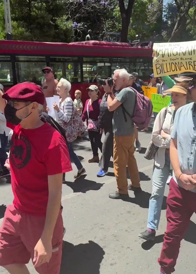 A group of people is walking down a paved city street, apparently protesting. A red bus is parked on the side of the road, partially obscuring the background. The people carry signs with protest messages. One man in the front holds a sign that reads “NO al CAPITALISMO IMPERIALISMO FASCISMO”. Other signs are visible further back. Most of the protesters are adults, and many are wearing sunglasses and hats. The weather seems sunny. There are trees lining the road.