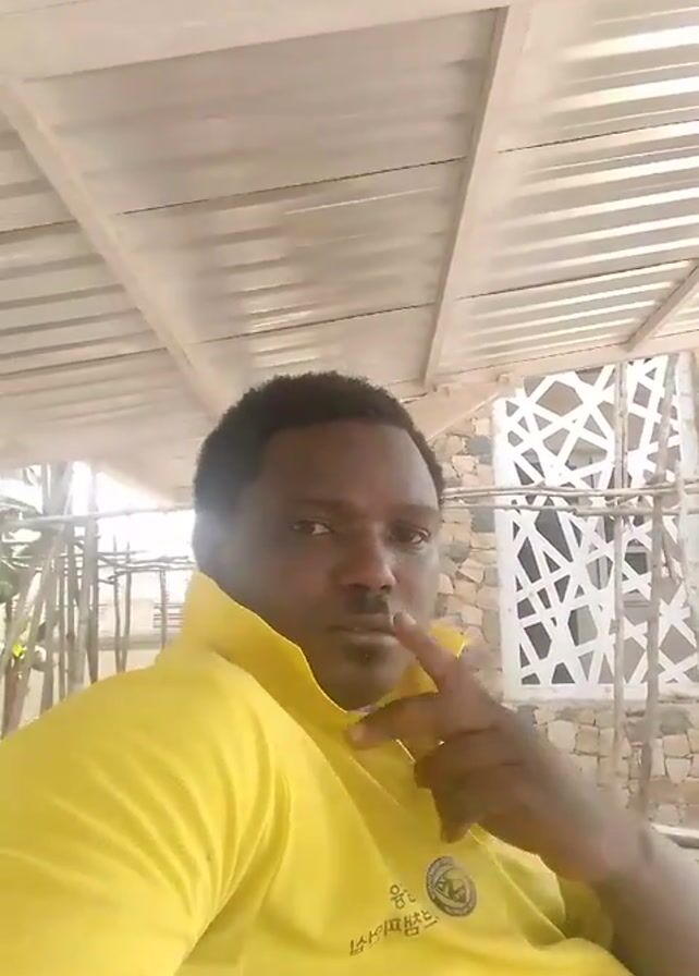 A man is sitting in a chair. He has dark hair and is wearing a yellow polo shirt. He is looking directly at the camera and has one finger raised to his lips as though deep in thought. The background includes a corrugated metal roof, a building with a stone facade, and some construction scaffolding.