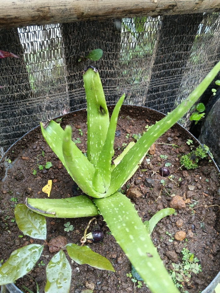 An aloe vera plant occupies the center of the image, potted in dark, loamy soil with small pebbles scattered around. Several leaves display slight damage, including dark spots and broken edges. Other greenery, possibly weeds or small plants, grow in the soil alongside the aloe. Fallen leaves and a yellow tag-like object rest near the base of the aloe plant. A coarse, dark-colored fence forms the background, partially obscured by foliage.