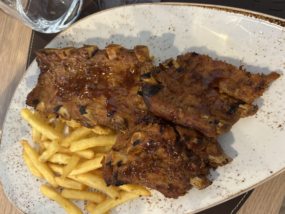 The image displays a meal served in a dining establishment in Bellagio, Italy. The central subject is an oval, off-white ceramic plate with a speckled, light brown rim, holding a portion of food. On the plate are three segments of barbecued ribs, coated in a glistening, reddish-brown sauce with visible red pepper flakes and char marks. To the left of the ribs is a pile of golden-yellow french fries. A clear glass containing water is partially visible on the upper right, resting on a dark brown placemat with a textured edge. The placemat is situated on a light-colored wooden table surface. No people are visible.