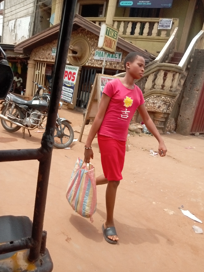 The image captures a young female walking on an unpaved, reddish-brown dirt road in Umudioka, Nigeria