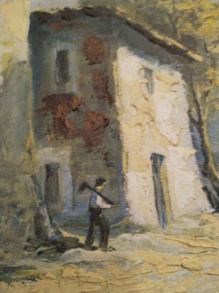 An impressionistic painting depicts a figure in dark clothing and a light-colored shirt, carrying a tool over their shoulder. They stand before a building with a mix of light and shadowed areas. The building’s surface is textured, suggesting age or disrepair, with patches of brown and light tones. Trees are painted in the background, adding a sense of depth and surrounding landscape. The overall scene exudes a rustic or rural atmosphere.