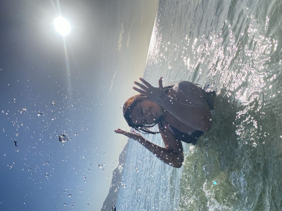 A sunlit image shows a person waist-deep in the ocean, their face obscured by a hand. Sunlight glitters off the water's surface, while droplets spray into the air towards the bright sun. The person's partially submerged body and arms appear wet. Ocean horizon and sky are visible.