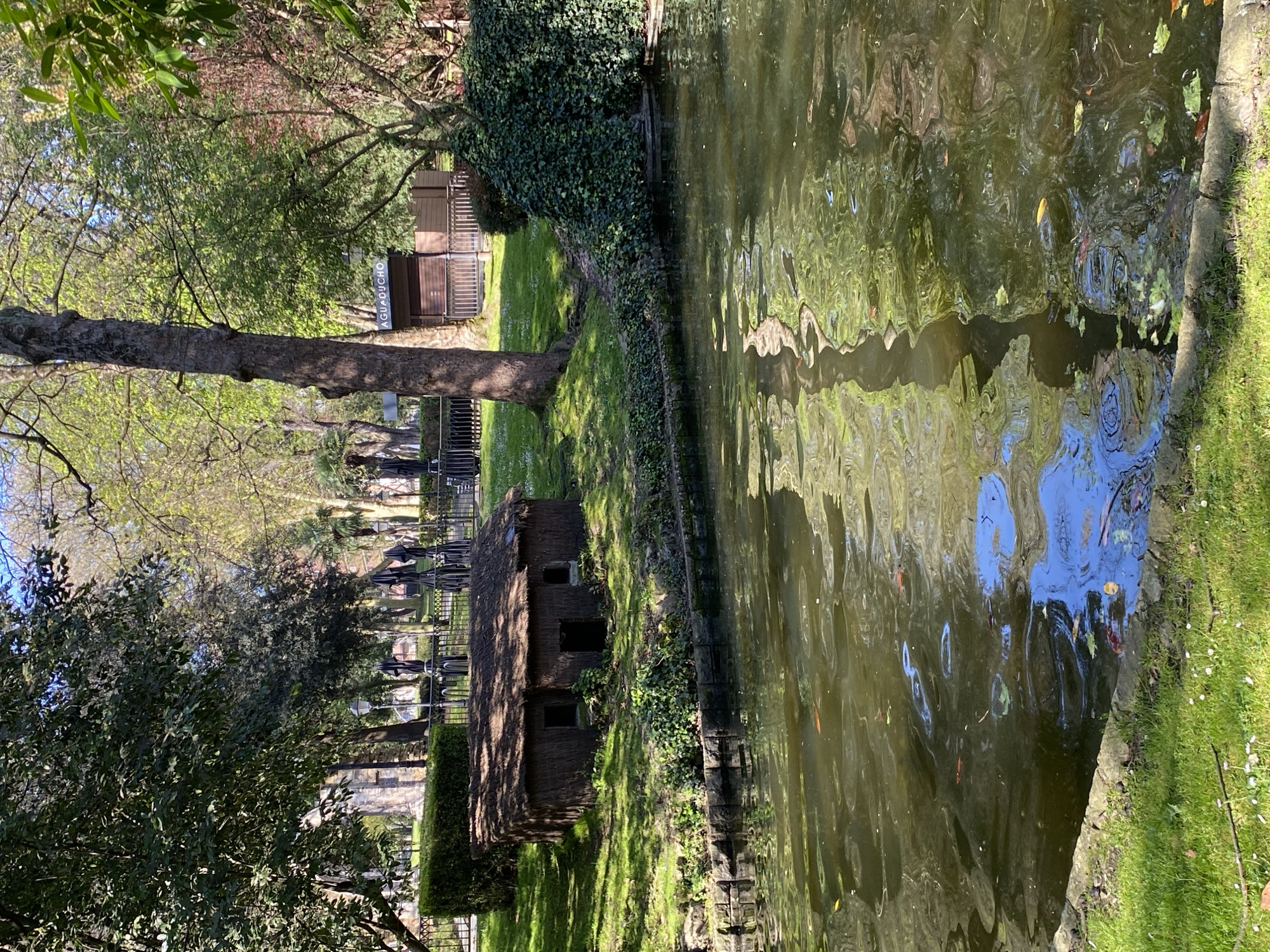 The image depicts a daylight scene within the Parque de San Francisco in Oviedo/Uviéu, Spain, specifically focusing on a section of its duck pond and surrounding landscape. In the foreground, a body of water with a murky green hue reflects sunlight, overhead trees, and segments of a clear blue sky. Several fish, including visible orange and darker specimens, are present in the water, interspersed with scattered floating leaves. The pond's immediate edge is fortified with a stone retaining wall. Adjacent to the pond, on a sun-drenched grassy bank, stands a miniature, single-story structure. This building features a textured, thatched roof and walls, with two square openings resembling windows and one larger, rectangular opening for a door visible on its façade. The bank itself is covered in vibrant green grass, dotted with small white flowers. To the right of the pond, a dense mass of dark green ivy covers a sloping embankment. The midground and background are characterized by abundant park foliage, including large trees with both bare trunks and full, verdant canopies indicative of spring or early summer. Through the trees, several park amenities are discernible: a brown wooden kiosk with the word "AGUADUCHO" prominently displayed in white lettering, multiple black outdoor umbrellas that appear folded and stored behind a black metal fence or railing, and dark-colored lampposts. No individuals are present in the frame.